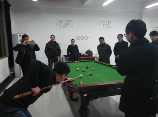 从12月12日下午开始,院分工会开展了学院教职工中式台球比赛活动,比赛每天下午进行,采用中式台球的比赛规则,裁判由院工会委员轮流担任。共进行四轮比赛,第一轮(16进8),采用五局三胜制,第二轮(8进4)采用七局四胜制,第三轮(半决赛)采用九局五胜制,最后决赛采用十一局六胜制,比赛决出冠亚军!目前比赛正在如火如荼的进行之中,八强选手全部产生!