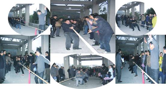 参加这次拔河比赛的共有18个代表队,场外阴雨连绵,场内却热气腾腾。18个代表队分为A、B两组,比赛之前,各代表队拉拉队纷纷为参赛队员呐喊助威,整个比赛场地显现出一派龙腾虎跃的气势,各参赛队员个个磨拳擦掌,跃跃欲试,象一只只下山的猛虎,呼吼着震天的呐喊,个个都想把对方压倒。