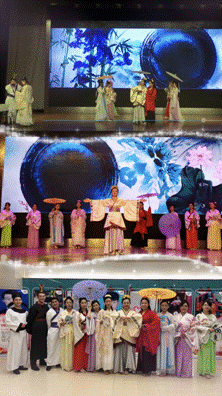兼霞苍苍,白露为霜,所谓伊人,在水一方。云想衣裳花想容,春风拂槛露华浓。幽幽千年,熠熠华服。伴随着一首具有古典韵味的乐曲,机械学院的老师们着汉唐服饰,缓缓走上舞台,时而小家碧玉、时而端庄大气,从汉朝气势恢宏的格调里走来,惊艳了大唐长安华灯初上。短短的五分钟时间展示了汉唐时期的服饰、礼仪文化及机械学院教师积极、向上,生动、美丽的女性风采。