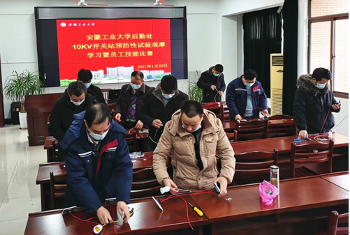 2021年1月23日,后勤处水电、维修中心共同举办员工培训暨技能比赛活动。活动分三个阶段,一是请专业技术人员讲授高压配电相关注意事项及应急方法;二是组织水电工参加技能比赛(包括笔试和操作两部分);三是组织水电工及相关技术人员现场观摩10KV配电设施预防性试验过程,提升专业技能和操作规范性。此次活动进一步提升水电保障及应急处理能力,开阔了视野,提升了专业技能。